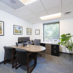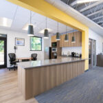 Relocating their office, North Point Builders was looking for an office that represented who they were. Featuring masculine finishes and exposed structure, this office showcases this construction company and their capabilities. Brick from a nearby school that they renovated was incorporated into the main conference room. Their break room opens into the open office area, providing a large congregation area for full staff meetings.