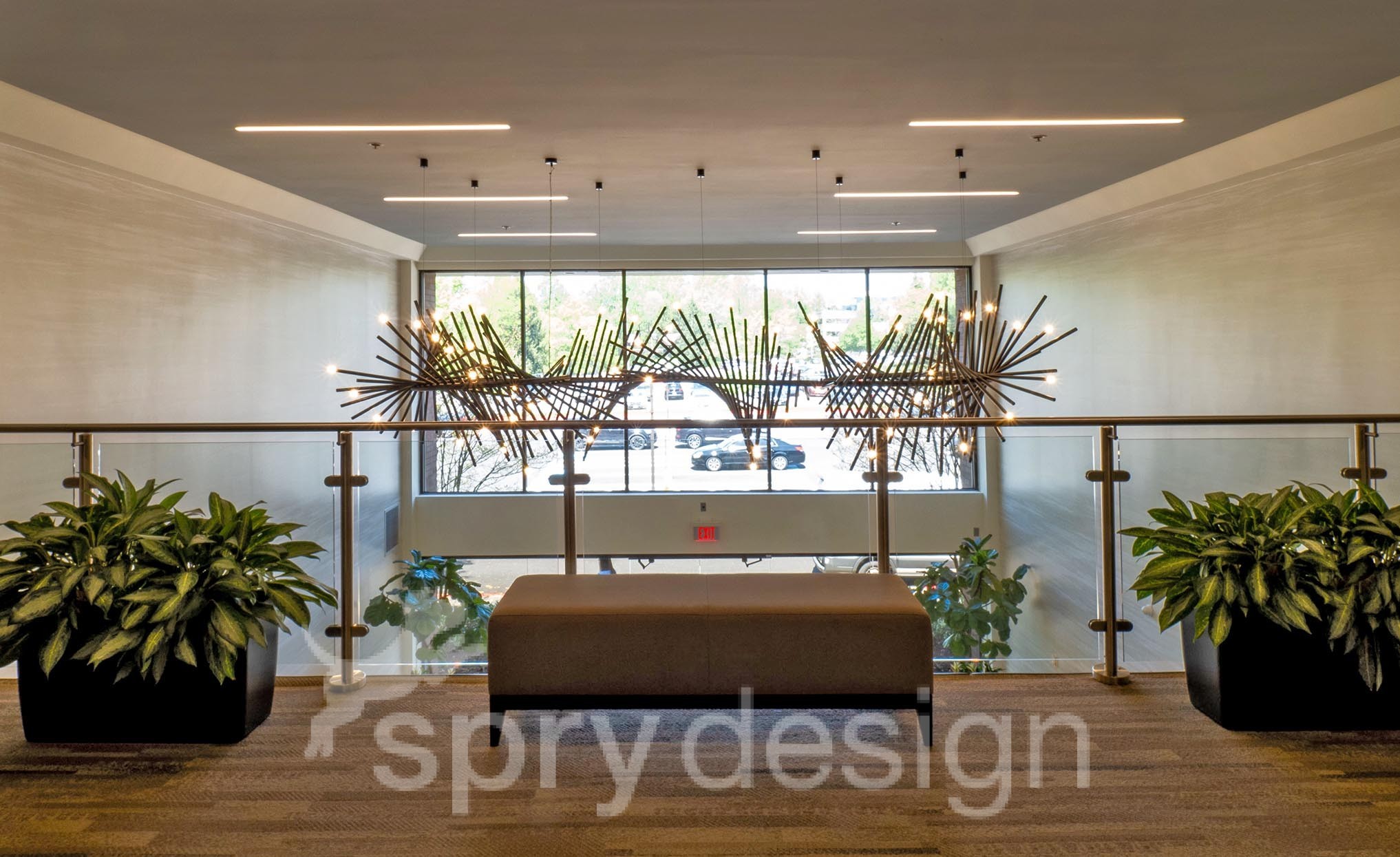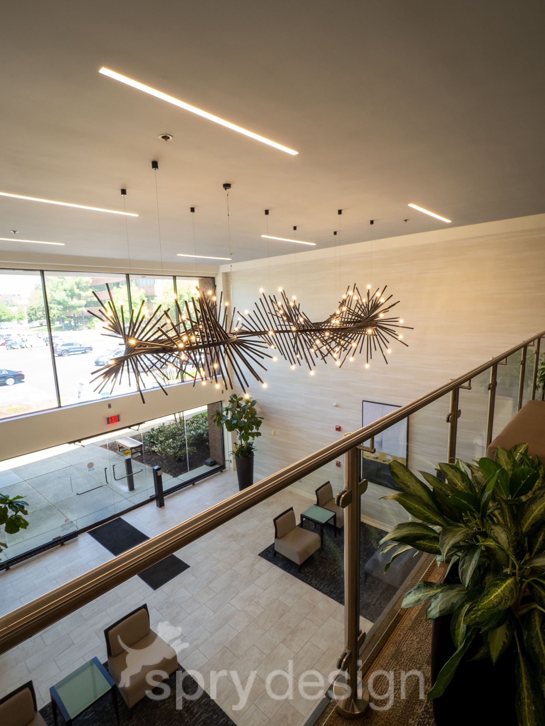 The lobby of this building was looking dated and had no sense of arrival.  Spry Design added new finishes and artwork along with a custom sculptural chandelier to bring this space to life!